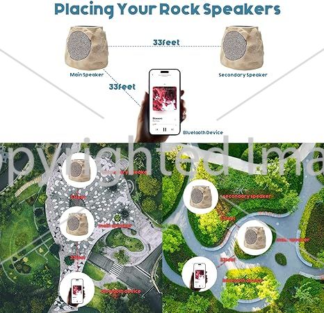 - BLUETOOTH & Dual speakers permeable system:The outdoor rock speakers waterproof can be paired via Bluetooth up to 30 feet away, with just a touch of a button connect your Bluetooth enabled device and listen. Includes Bluetooth 5.0 to pair with any 2 speakers for an immersive experience via only 1 Bluetooth device